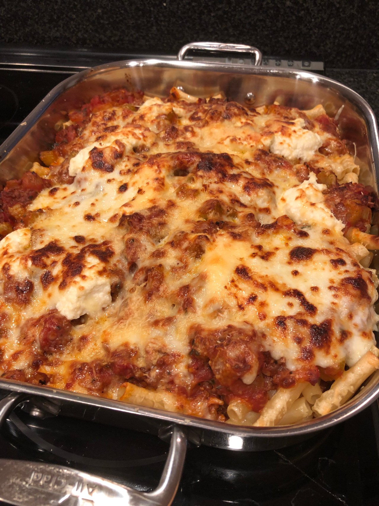 Preheat oven to 350F. Grease a lasagna pan or baking dish. Heat a large dutch oven and add the ground beef and ground sausage, and cook until browned and cooked through. Remove with a slotted spoon and set aside. Add 2 tbsp olive oil and saute the onions and celery until translucent. When cooked through but still slightly crisp, add the garlic, oregano and chili flakes. Season with salt and pepper. Add the crushed tomatoes, tomato sauce, sugar to taste (to your preferred level of sweetness) and season with salt and pepper. Simmer for 15-20 minutes to let the flavors develop, tasting and seasoning throughout as needed. Meanwhile, cook the Ziti noodles in heavily salted water, 2 minutes under the box directions. When cooked and slightly al dente, drain and toss with olive oil to prevent the noodles from sticking together.