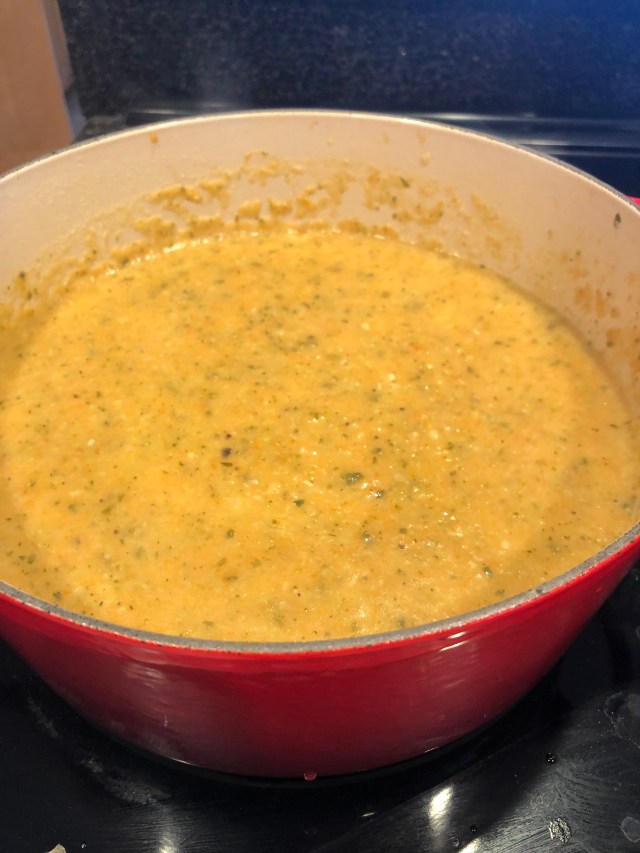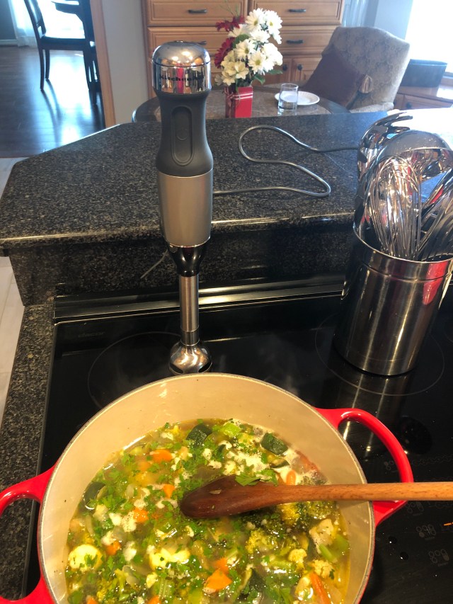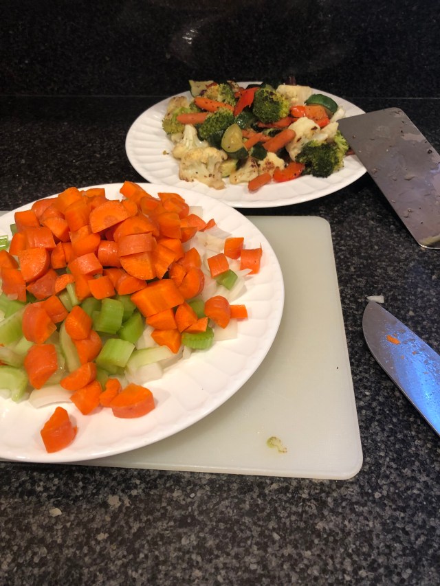 My first thought was Ham and Split pea soup, but I’m really not a big fan of split peas. The beef is basically a meal (and a $65 cut of meat), we’ll have that for dinner. Ah – bingo – I’ll roast the vegetables in the oven to bring out their flavor and whip up a standard soup base of onions, carrots and celery. I’ll add garlic, thyme and use my new immersion blender – thanks Dad & Debby – and blend the soup to be a smooth puree. To finish it off, since I can’t leave well enough alone, I’ll add half the leftover truffled mashed potatoes which will help thicken the soup and add great flavor!