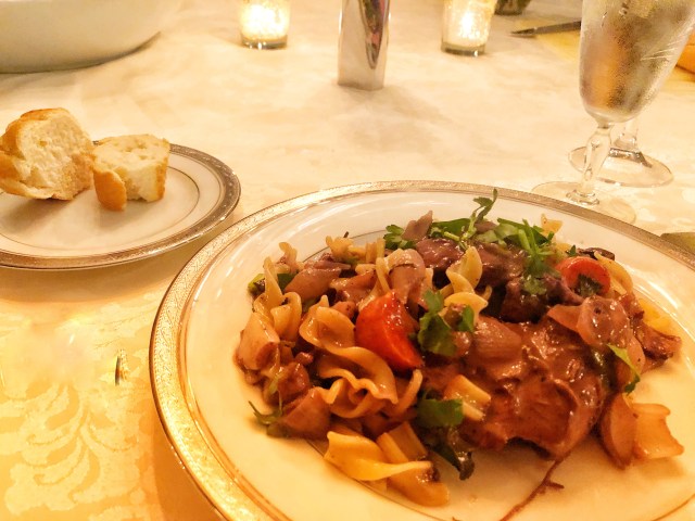 When it comes to romantic dining, I don’t think it gets any better than French cuisine. There’s just something elegant and fabulous when you make French food. Coq au Vin sounds fancy, but it’s really just chicken cooked with wonderful French flavors in red wine (ironically Italian wine)! Inspired by Geoffrey Zakarian, I use chicken thighs in my Coq au Vin since I think they are a littler juicer; I also marinate the chicken in the wine with the vegetables for several hours to really infuse the flavor. Served over a bed of buttered egg noodles with fresh parsley, this dish will have your lover googly-eyed all night! Bon appetit!
