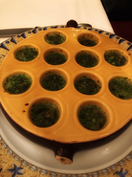 Although I’ve “had” soufflé, I’ve apparently never eaten it before! OMG was this place delicious! We had read all the excellent reviews about Le Soufflé, and I have to admit I wondered: “how great can it be?” Out of this world great, is the answer! To start, I had the cheese soufflé and Andrew had the garlic butter snails. Both were TO DIE FOR! I don’t eat fish, but the garlic butter Andrew’s snails were in was outstanding. And the cheese soufflé? So light and airy, I swear it was like eating a cloud! I have some SERIOUS recipe testing to do when I get home to try and replicate this dish. The soufflé was like eating air! I have three theories on how they do this: