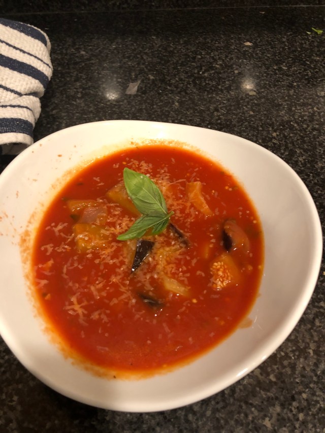 Yes we are still here! Matt and I have been traveling and have been taking on new responsibilities at work, but we have not forgotten about you. We are very excited to travel to Tuscany next month with our mothers and decided we need to lose weight. I was trying to think how can I make favorite recipes of mine healthier. I LOVE tomato soup. I can eat it with a straw. So why not take away the heavy cream (sigh) and add eggplant and make this a healthy entrée? I did that tonight and it was fantastic. Here is the recipe;