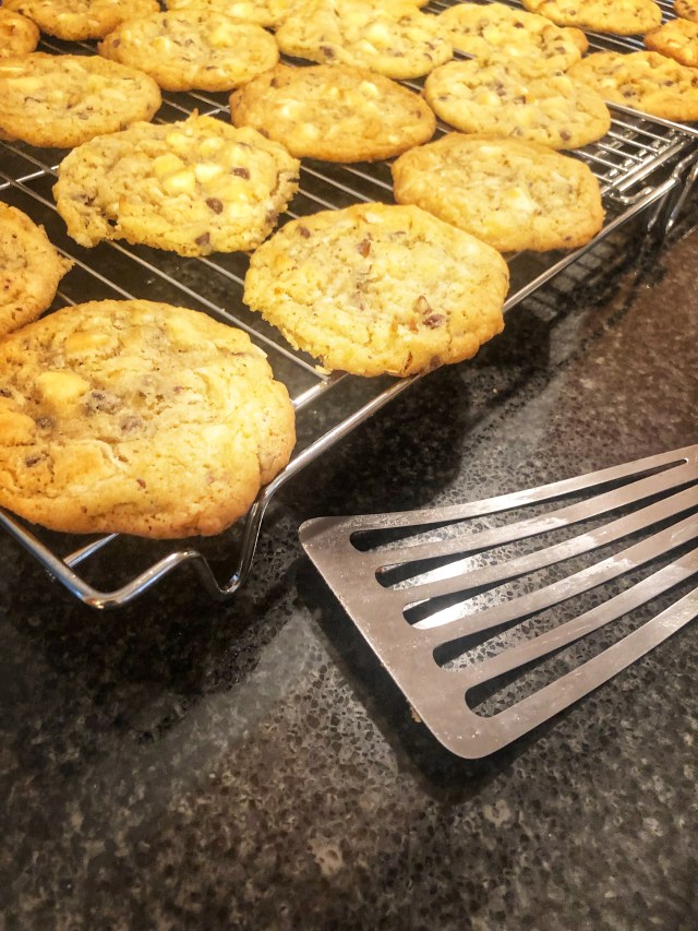 Using a spatula, mix in the chocolate chips and coconut, mixing thoroughly but not over mixing. With a small ice cream scoop (1″ diameter), scoop 12 cookies, evenly spaced onto each parchment-lined pan. Refrigerate for 15 minutes and then bake for 12-15 minutes until the edges are browned and the middle is just set. Cool on the pan for 5 minutes and transfer to wire racks to cool completely (or sneak some hot cookies). Repeat for the rest of the batter. Welcome home, and enjoy!