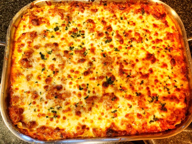 When I’m making big-batch recipes with a lot of ingredients and steps, one of the best tips I have is to split the process over two days. When it comes to Lasagna or Spaghetti, the sauce is always better the next day anyway; but, by making the sauce one day, and assembling the Lasagna the next, it doesn’t seem like such a big job. Often in the winter when it’s a cold and dreary weekend, we’ll have a “freezer cooking marathon,” and we’ll stock our freezer with all sorts of premade meals for the months ahead – and, Lasagna is ALWAYS on the list! And, if you’re a parent (which thank goodness we aren’t), your kids will love eating this hearty and tasty meal. Bon appetit!
