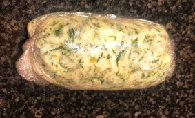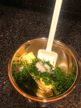 In a small bowl, combine the butter, dill, parsley and garlic with 1 teaspoon of salt and 1/2 teaspoon of freshly ground black pepper until combined. Stretch a piece of plastic wrap on the counter, and using a spatula, place the butter in the middle of the plastic wrap. Using the wrap, fold the butter over and twist at the ends into a 2″ diameter log. Freeze for at least 1 hour.
